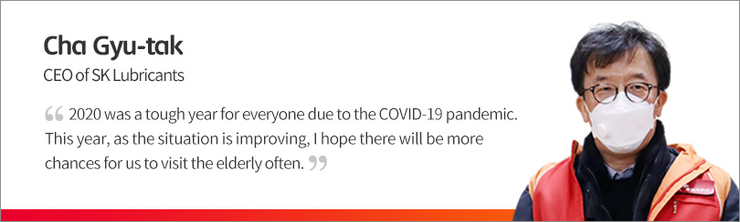 In total, CEOs and members of SK Global Chemical and SK Lubricants has visited 59 households of the elderly living alone. Despite some limits due to the current situations, all of the volunteers tried their best to share the warmth with the elderly while strictly followed the prevention guidelines.