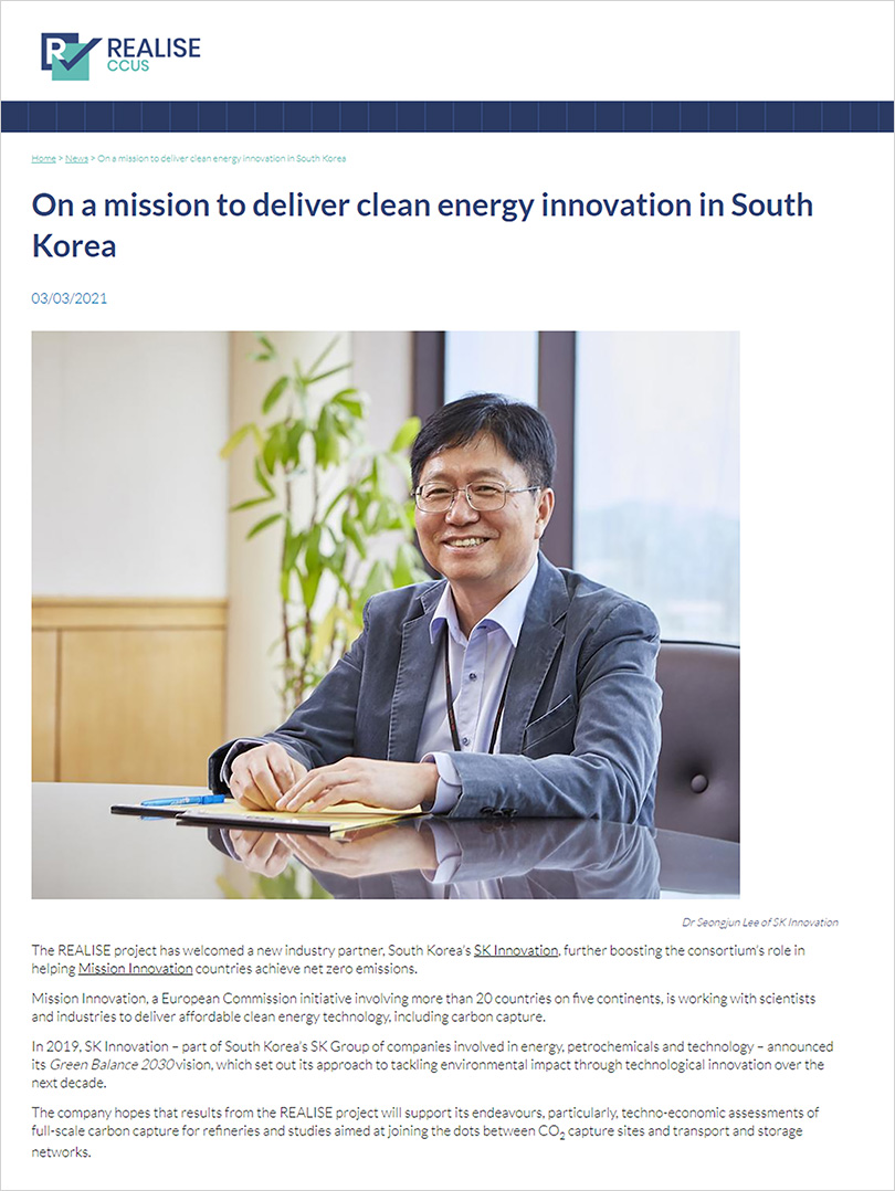 ▲ REALISE CCUS project released an article to introduce SK Innovation as a new industry partner on its homepage on March 3rd 2021 (http://realiseccus.eu/news/mission-deliver-clean-energy-innovation-south-korea)