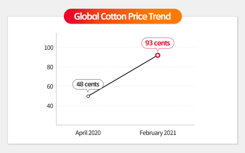 In fact, global cotton prices have risen steadily since September 2020 as demand for clothing increased in anticipation of the recovery after COVID-19, along with the shortage of cotton supply following the U.S. ban on imports of Chinese cotton. According to related industries, global cotton prices have soared from 48 cents per pound, which was the lowest in the last 10 years in April of last year, to 93 cents per pound as of February 24th this year.