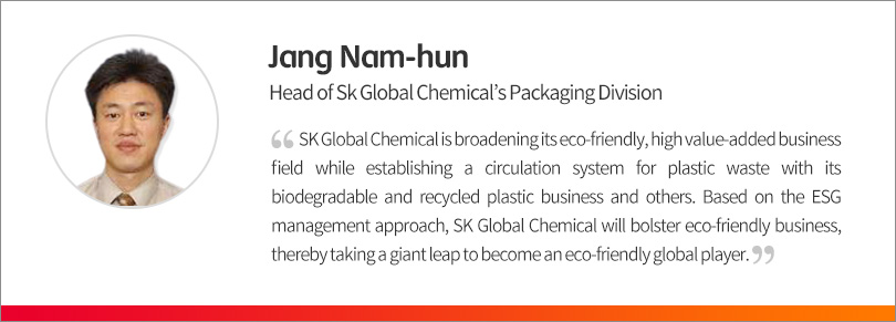 SK Global Chemical is focusing on expanding eco-friendly business with the goal of establishing a plastic circulation system, taking the lead in solving the problem of waste plastics. The company has been making various efforts, such as making new plastic products by recycling waste plastics, developing eco-friendly/high value-added products that are easy to recycle, and reducing plastic usage by producing high-functional products.