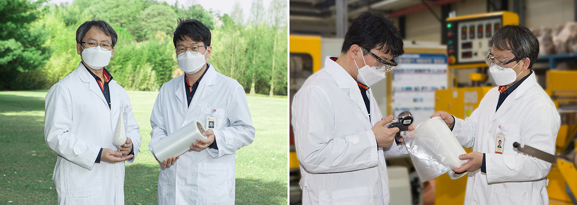 ▲ Researchers hold a sample of PBAT product jointly developed by SK Global Chemical and Kolon Industries