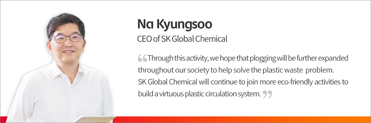 On the 22nd, CEO of SK Global Chemical Na Kyung-soo and company members kick off the program by participating in plogging activity in the Han River area in Seoul, Korea, collecting garbage including plastic waste like plastic bags and disposable cups. The event was also taken up by members of SK Global Chemical working at Daejeon, Ulsan, and Shanghai on the same day.