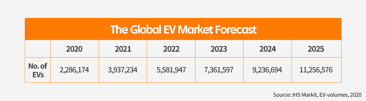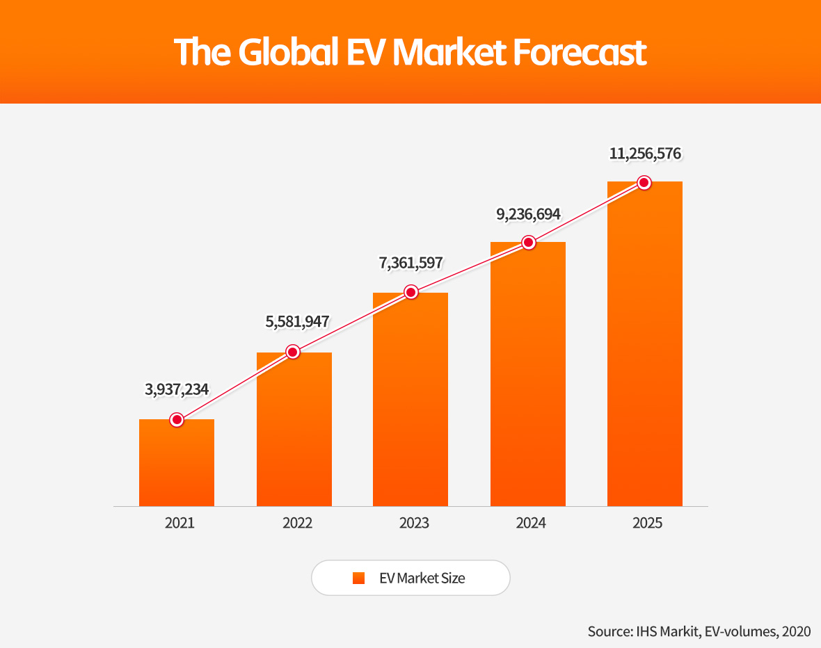 Recently, the global mobility market is transforming rapidly to EVs. Market research firm IHS estimates that the EV market will include about 3.94 million vehicles this year. It is predicted that the size of this market will increase by more than 70% from 2.28 million vehicle last year, and much more rapidly to about 11.26 million vehicles by 2025, which is four years from now. As a result, global automakers such as GM and Ford are also announcing their plans to convert 100% to EVs.