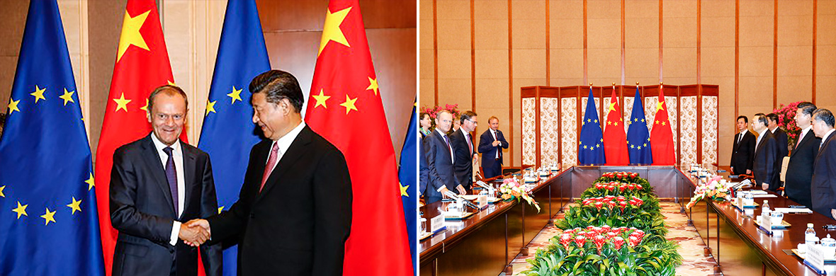 ▲ Representatives of China and the EU at the Summit, including Donald Tusk, President of the European Council (left) and Xi Jin Ping, President of China (right). Source: European Union