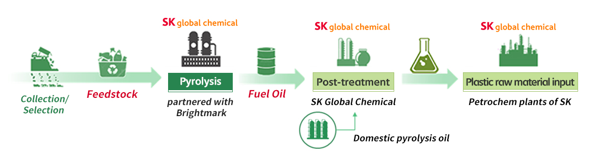 ▲ Pyrolysis oil production process flow model suggested by SK Global Chemical, Birghtmark, and SK Incheon Petrochem