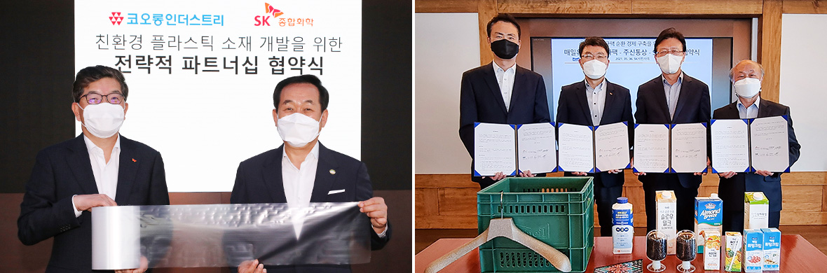 ▲ (Left) SK Global Chemical and Kolon Industries show a sample of PBAT product jointly developed by the two companies and announced to launch it in Q3 this year / (Right) SK Global Chemical, Maeil Dairies, Tetra Pak Korea, Jushin Trading signed an MOU to promote aseptic cartons recycling in May 2021.