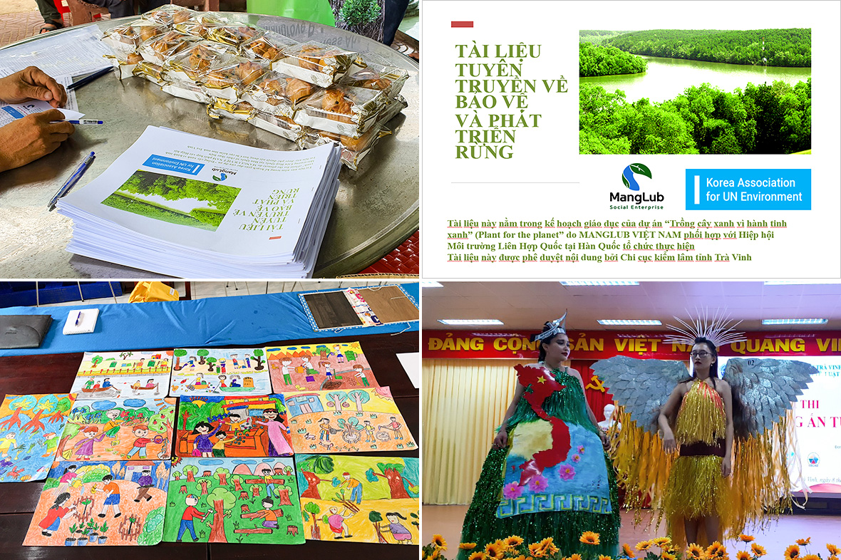 ▲Some activities organized by Manglub in 2020: (Top) The handouts prepared by Manglub to help local people raise awareness of forest protection / (Bottom left) The drawing contest under the topic of Environmental Protection for students at Dong Hai A elementary school / (Bottom right) The eco-friendly fashion contest participated by students at Tra Vinh University