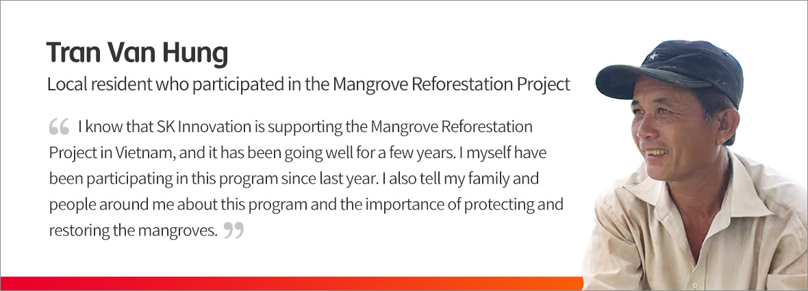 The Mangrove Reforestation Project is one of the main activities supported by the “Sharing 1% Happiness” Fund of SK Innovation employees. This is a special fund in which the members of the company voluntarily donate 1% of their basic salary to contribute to the company’s social contribution and environmental protection programs.