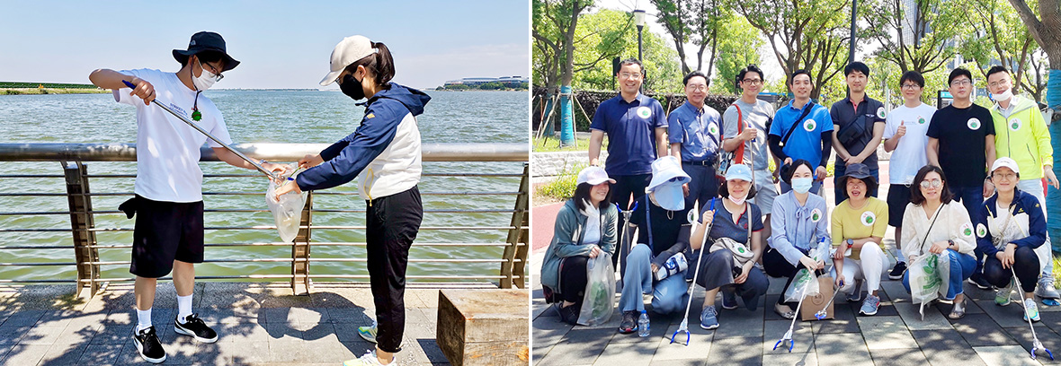 On June 22, about 20 members of SK Global Chemical’s China Investment Management Office participated in plogging activity around Dishui Lake, an artificial lake in Shanghai. On this day, the members reaffirmed their strong will to protect the environment while picking up the wastes, especially plastic that were floating along the lake shore.
