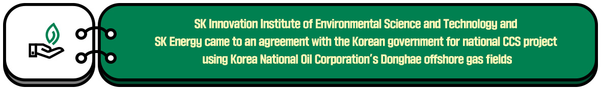 On May 26th, SK Innovation made an agreement for the national CCS project using the Donghae Offshore gas fields of the KNOC. SK Innovation and SK Energy, one of its affiliates, joined the national project to collect and store CO2 in the gas fields where extraction of natural gas will be finished in June 2022. This project aims to capture annually 400,000 tons of CO2 from 2025. SK Innovation and SK Energy will develop the models for source of the capture and capturing technologies.