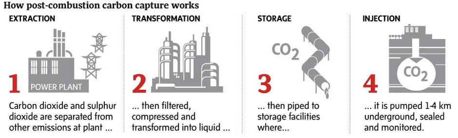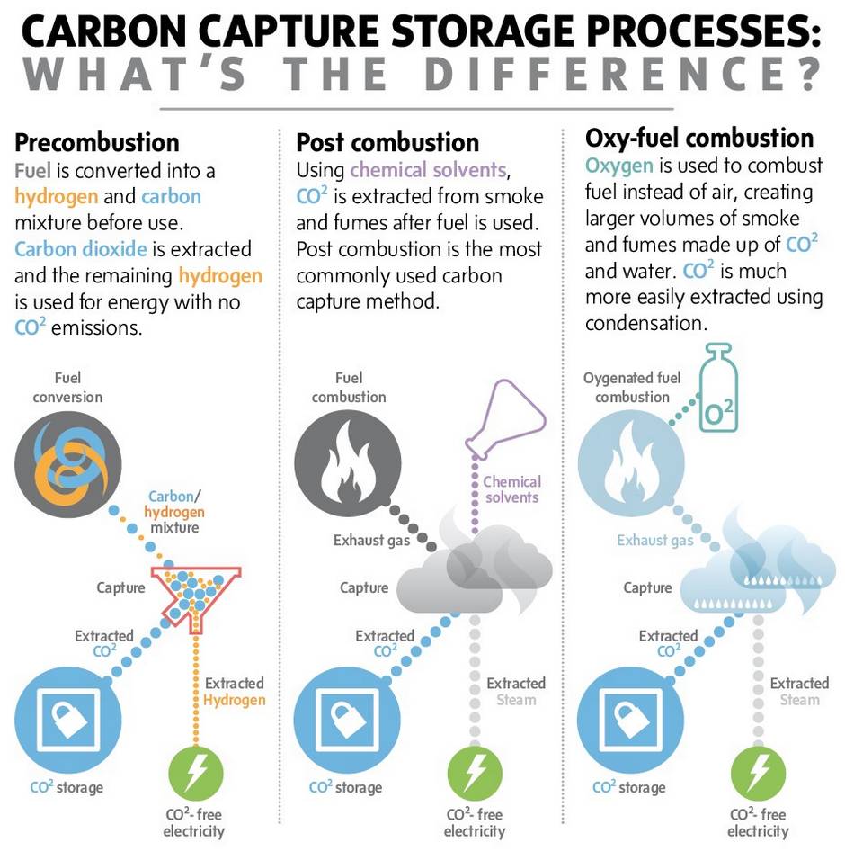 There are three approaches to capture CO2: pre-combustion capture, post-combustion capture, and Oxi-combustion. Pre-combustion capture gasifies carbon fuel to transform it into hydrogen- CO2 compound and then capture CO2 from it, while post-combustion capture collects CO2 from the gas generated by combustion. Oxi-combustion separates Oxygen from the air.