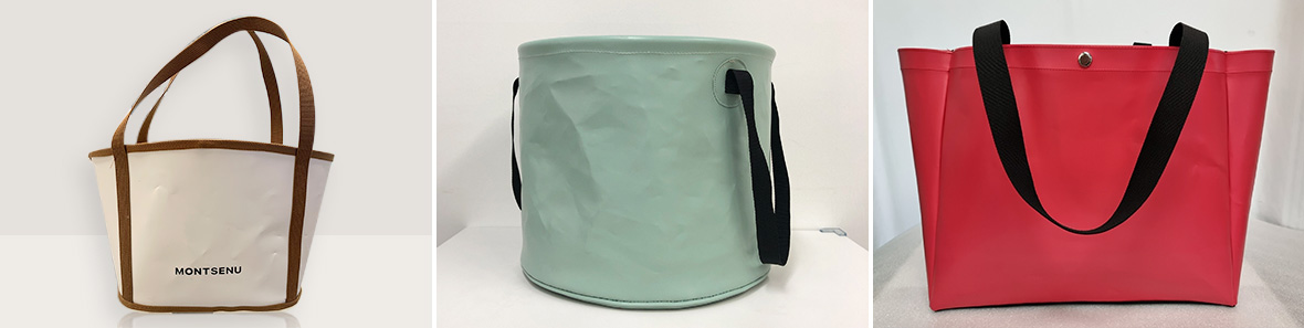 ▲ Products made with the upcycled fabric: Montsenu (left), Right Route (center), Usisan (right)