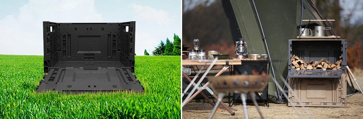 ▲(Left) MinimalWork’s upcycled product Folding Box Eco made from SK Global Chemical’s R-PP / (Right) Folding Box Eco used as a container for firewood at a camping ground