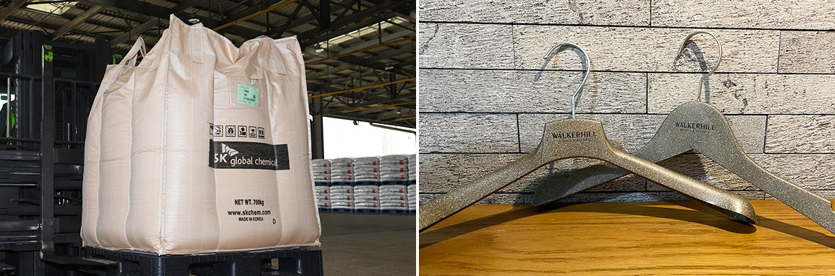 (Right) Hangers made by SK Global Chemical using poly-aluminum (PolyAl) from aseptic cartons