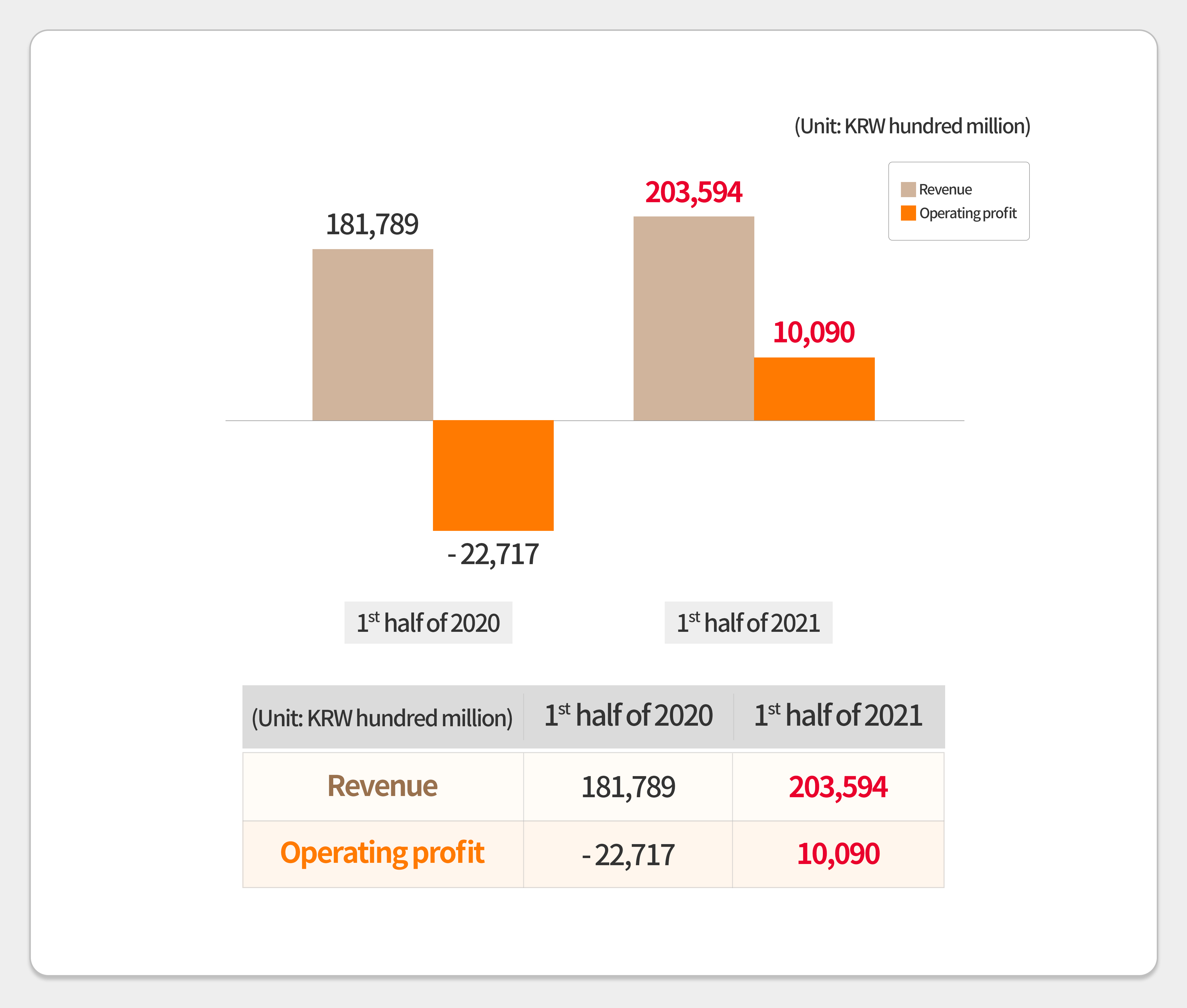 Based on these results, in terms of results in the first half of the year, sales went from KRW 18.17 trillion last year to KRW 20,359.4 billion, and operating profit turned to a surplus of KRW 1.09 trillion from an operating loss of KRW 2,271.7 billion last year. It is the first time in 3 years since 2018 that operating profit in the first half of the year exceeded KRW 1 trillion.
