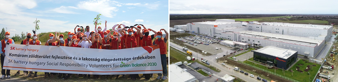 ▲ (Left) SK Battery Hungary members participate in company’s volunteer planting tree activity in June, joined by Komárom Mayor Attila Molnár and CEO of SK Battery Hungary Han Sang-kyu / (Right) SK Battery Hungary’s plant in by Komárom