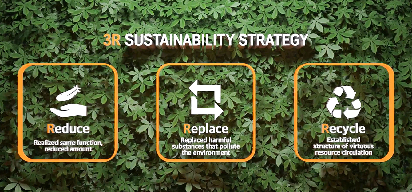 To resolve various plastic-related issues, SK Global Chemical enforces the 3R sustainability strategy – Recycle, Replace, and Reduce. The 3R strategy includes using physical and chemical recycling techniques to solve plastic pollution and combining the two techniques to introduce a new solution, replacing conventional chemical materials with eco-friendly materials, and using less plastic in packaging, and developing light-weight materials for car interior parts to reduce the volume of materials used by improving the material properties.