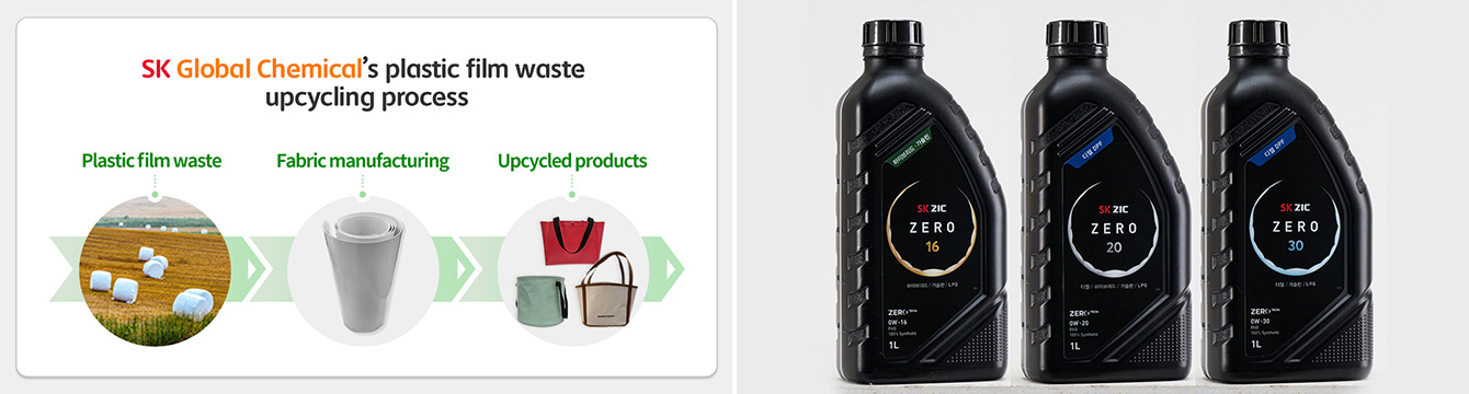 ▲ (Left) SK Global Chemical’s waste silage upcycling process / (Right) SK Lubricants’ SK ZIC ZERO engine oil using eco-friendly containers