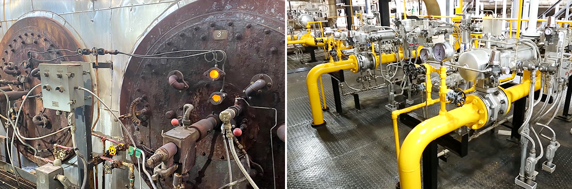 ▲ (Left) The existing Bunker-C boiler that Ulsan LCX had used for decades /(Right) Ulsan CLX’s power boiler that consumes eco-friendly fuel, LNG, only.