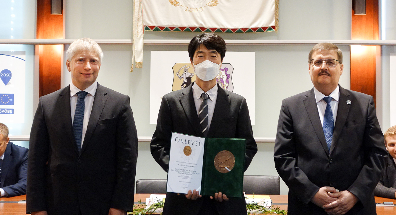 ▲ On September 10 (local time), SK Battery Hungary was awarded the “State Representative Enterprise Award” in recognition of its contribution to the local community by Komárom-Esztergom County. CEO of SK Innovation Hungary Han Sang-kyu (middle), Hungarian Government Commissioner Dr. Kancz Csaba (left), President of Komárom-Esztergom County Council Popovics György (right) pose for a commemorative photo.