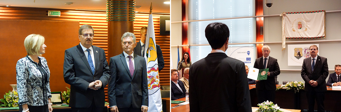▲ (Left) Governor of Komárom-Esztergom Popovics György (middle) greets the guests at the award event on September 10 (local time) / (Right) SKBH was awarded the State Representative Enterprise Award by Komárom-Esztergom County in recognition of its contribution to the local community.