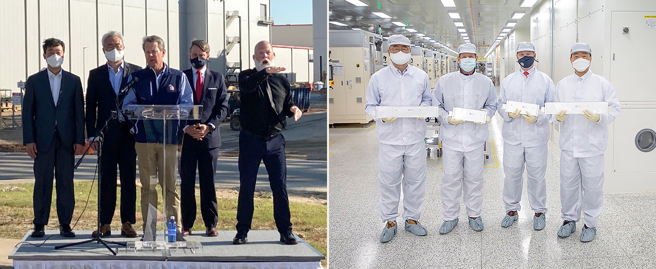 ▲ (Left photo) Georgia Governor Brian Kemp (third from left) delivers a speech during his visit to SKBA on April 19th / (Right photo) From left: CEO of SK Innovation Kim Jun, Georgia Governor Brian Kemp, Georgia Department of Economic Development Commissioner Pat Wilson and President of SK Innovation’s Battery Business Jee Dong-seob hold battery cells produced at SKBA’s plant on April 19th