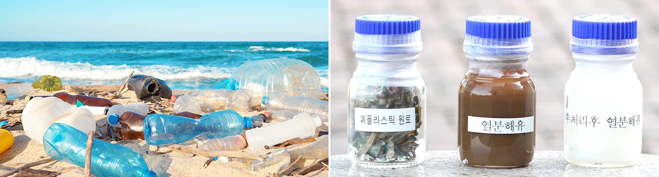 ▲ (Left photo) Indiscreetly discarded marine waste plastics / (Right photo) From left: Plastic wastes as a raw material for pyrolysis oil, pyrolysis oil, and post-processed pyrolysis oil.
