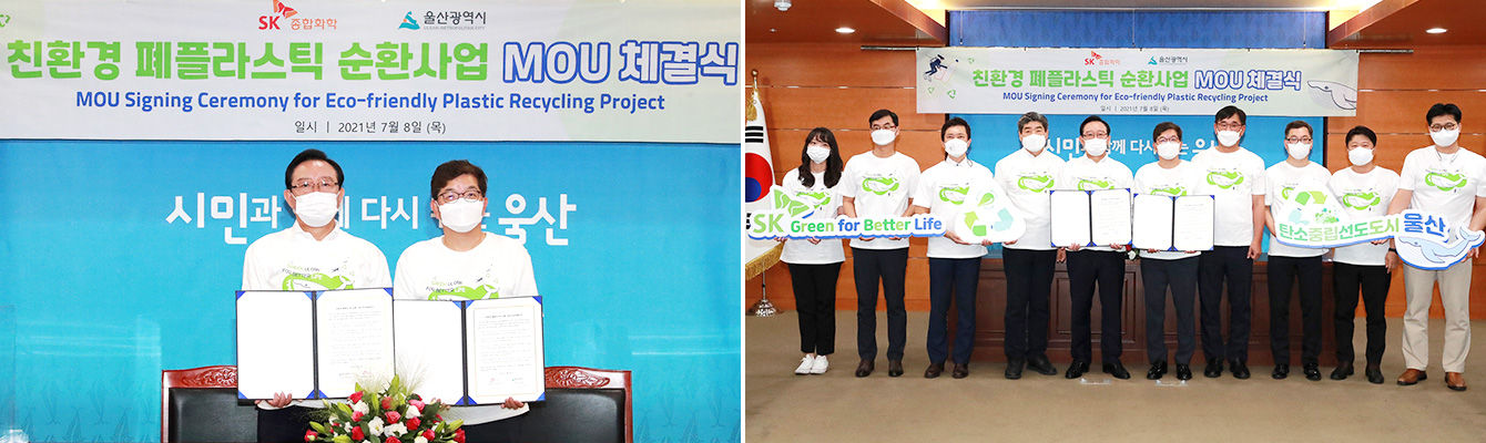 ▲ (Left) SKGC and Ulsan Metropolitan City joins an MOU for “Investment in Eco-friendly Urban Oil Field Project for Plastic Waste Recycling” in July 2021