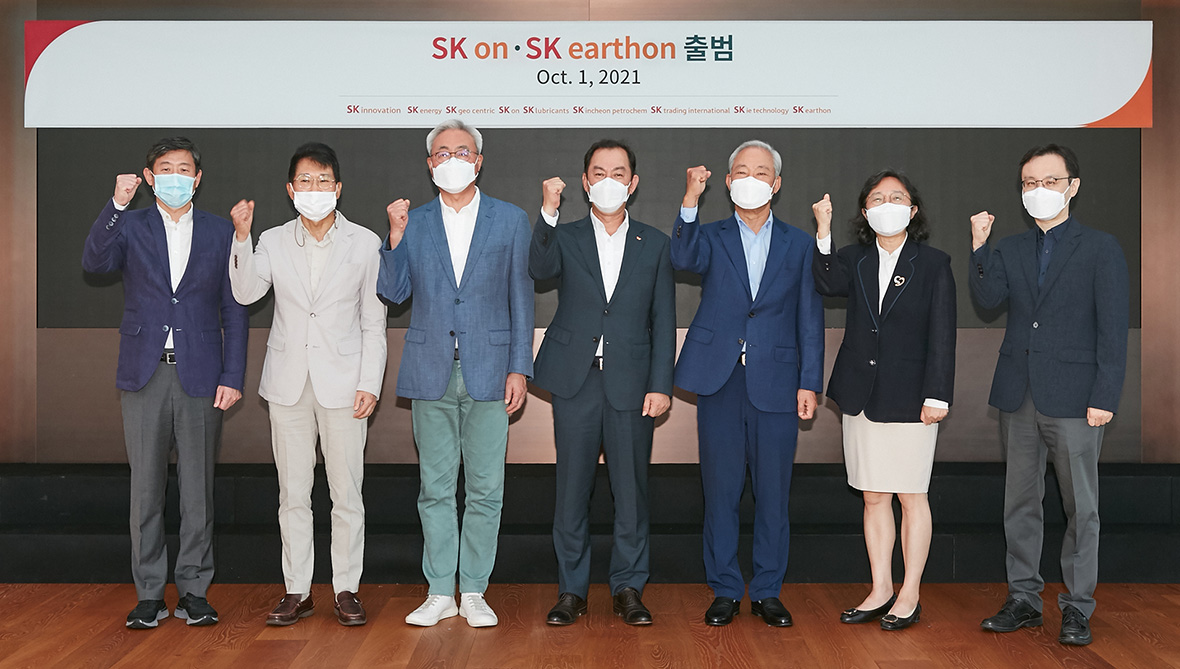 ▲ SK Innovation CEO Kim Jun (3rd from left), SK Eeathon CEO Myeong Seong (4th from left), and SK Innovation’s Chairman of the Board Kim Jong-hoon (3rd from right) pose for a commemorative photo at the launching ceremony of SK On and SK Earthon as independent companies held at SK Seorin Building (Seoul, Korea) on October 1st, 2021.