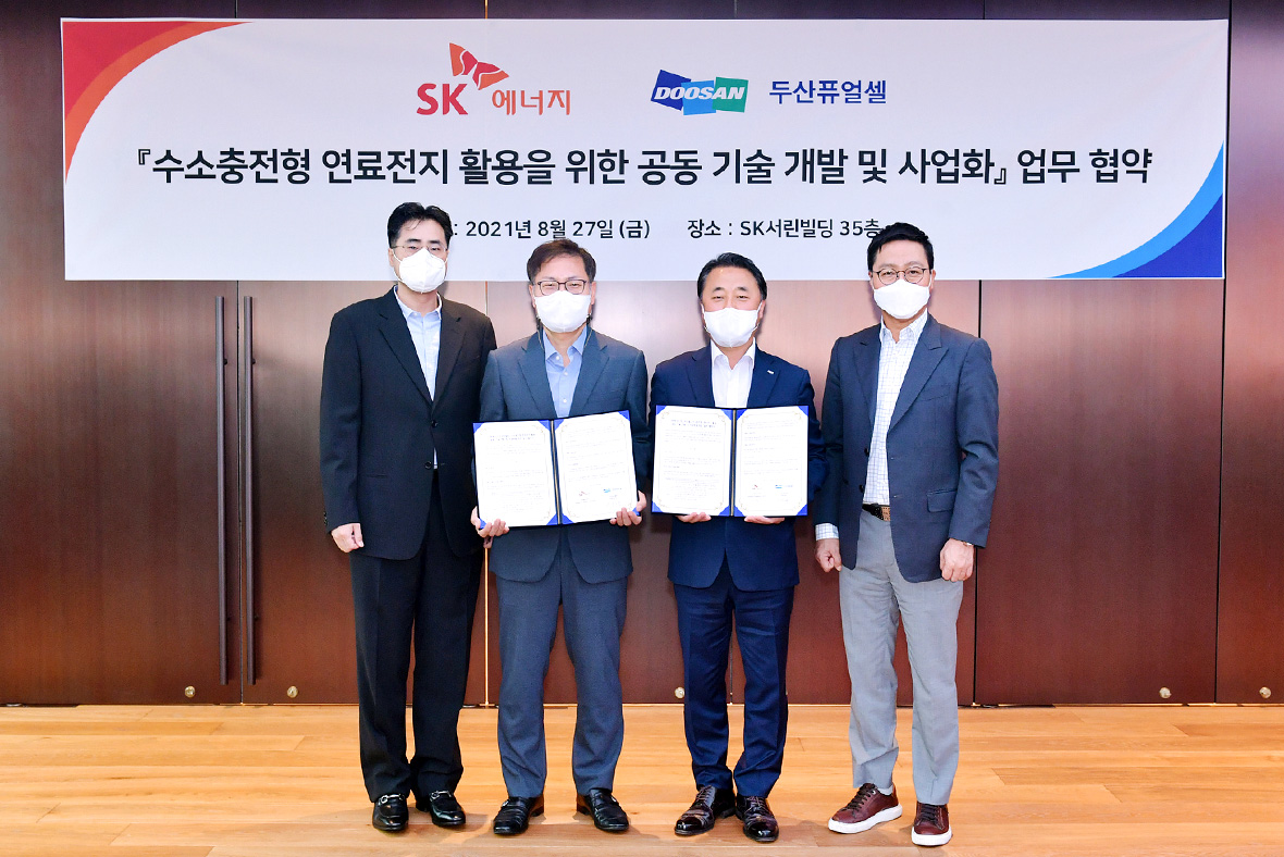 ▲ SK Energy sd a business agreement with Doosan Fuel Cell regarding “joint development and industrialization of technologies to utilize rechargeable hydrogen fuel cells” at SK Building in Jongno, Seoul, Korea on August 27th. First from left: Chang Ho-joon, Head of Solution & Platform Business Division, SK Energy.