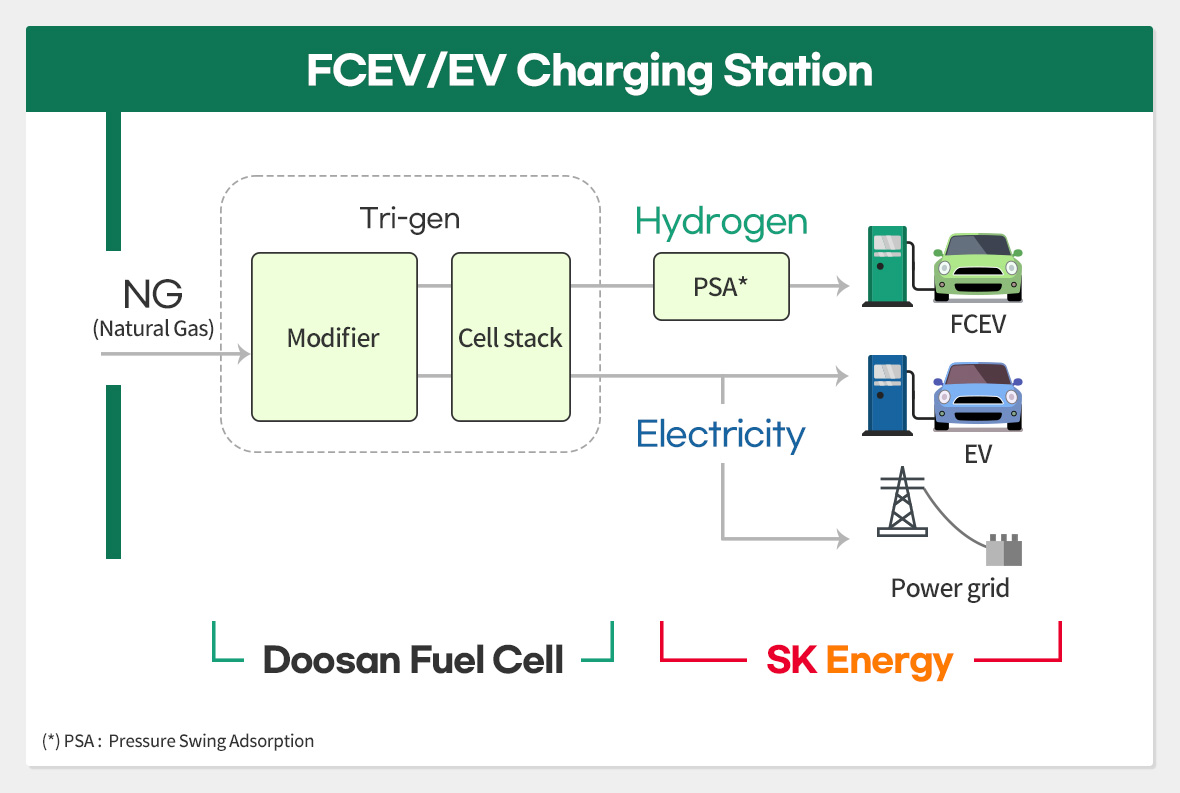 Doosan Fuel Cell has Tri-gen cells, which are capable of generating electricity, heat, and hydrogen simultaneously. These cells can generate electricity that can be supplied by connecting to existing power grids, and be used to recharge electric vehicles (EV). They also generate heat that can be used as a heat source inside the eco-friendly complex energy station. Moreover, the hydrogen produced can be used to charge fuel cell electric vehicles (FCEV). So, the project is for our two companies to jointly develop and commercialize these technologies.
