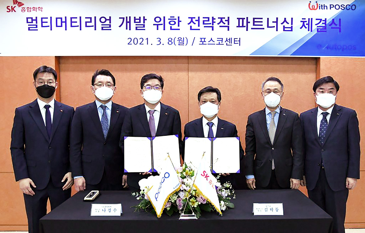 ▲ SKGC and POSCO signed an MOU for the “Joint development of steel-plastic composite materials for electric vehicles” on March 8, 2021. (3rd from left: SKGC CEO Na Kyung-soo, POSCO CEO Kim Hak-dong)