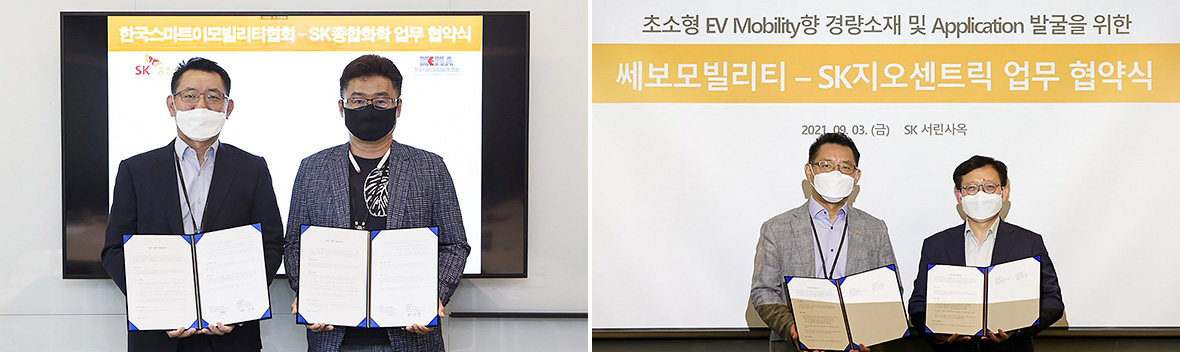 ▲ (Left) SKGC and the Korea Smart E-Mobility Association signed an MOU for the purpose of developing new materials to lighten the core parts of ultra-small electric vehicles in June 2021. / (Right) SKGC and CEVO Mobility signed an MOU to develop materials for ultra-small electric vehicles in Septemebr 2021.