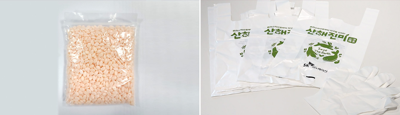 ▲ (Left) The biodegradable plastic PBAT / (Right) The biodegradable plastic bags used for SK innovation’s eco-friendly campaign Sanhaejinmi are made of PBAT produced by SKGC
