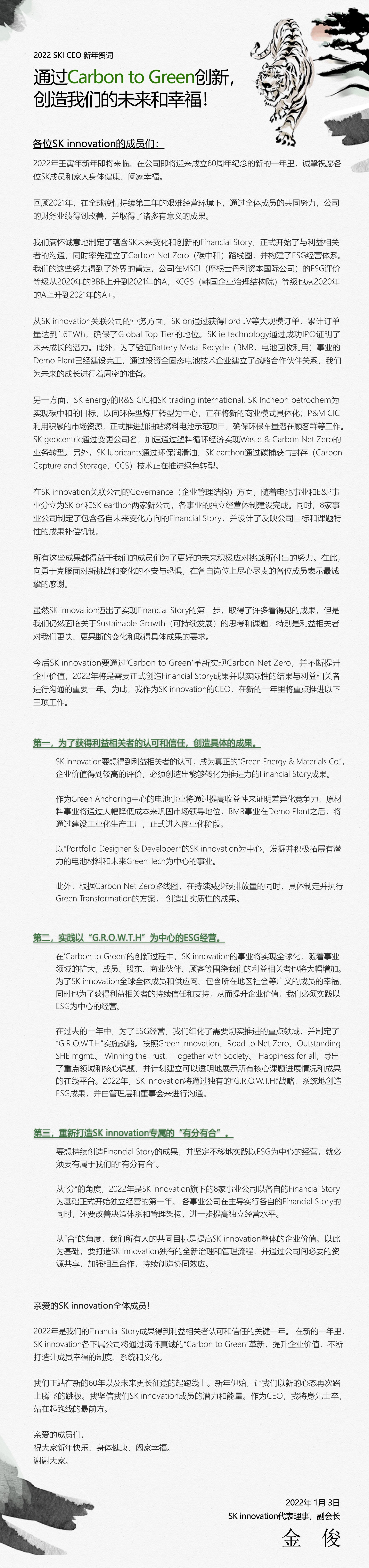2022 SK Innovation CEO,副主长的新年贺词 2022. 01. 03 SKInnovation 2022 SK Innovation CEO,副主长的新年贺词 AI Summary AI Voice Media Kit Previous Post Next Post Related Articles PRESS SK Innovation, SK On Partner with Standard Energy on Safer ESS 2026.01.06 CORPORATES SK Innovation Ulsan CLX recycles 100% waste materials via Solid Bed Merox (SBM) process 2022.08.10 CORPORATES PRESS CENTER SK Innovation Ulsan CLX to be the first in Korea to apply eco-friendly pyrolysis oil in refinery&petrochemical process 2021.09.30 CORPORATES INSIGHT SK Innovation’s endeavor to achieve Decarbonization by taking Green Transformation ② SK Innovation & SK Energy take the initiative in accomplishing Net Zero with CCS technology 2021.09.20