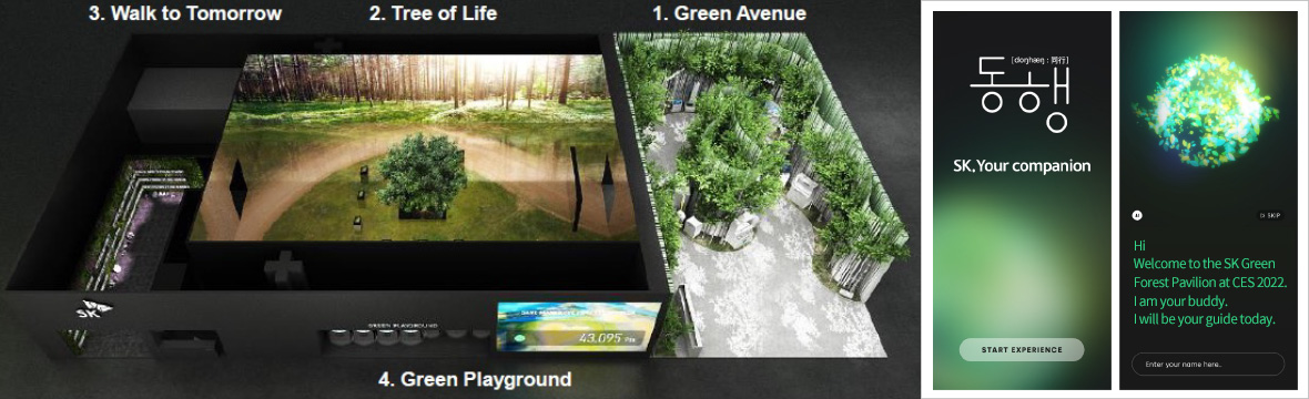 ▲(Left) Overview of SK’s Green Forest Pavilion at CES 2022 / (Right) “Donghaeng,” the Buddy application that helps visitors tour around SK Pavilion at CES 2022