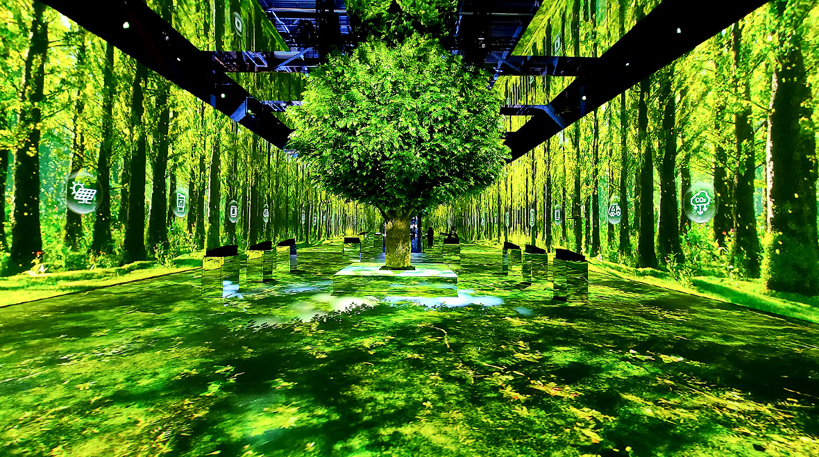 The Green Forest Pavilion of SK is divided into four zones where visitors can experience the Net Zero journey built with SK & Friends’ efforts to reduce carbon emission. In this journey, visitors can discover the story of the trees at Korea’s Indeung Mountain, which SK has been nurturing for many years, and find a huge tree symbolizing SK’s will for a sustainable future at the center of the Pavilion.