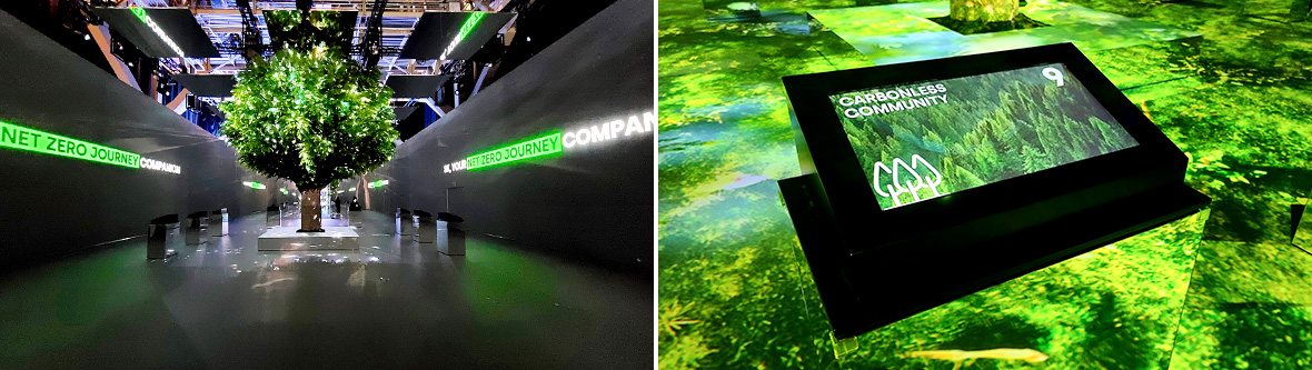 ▲ (Left) The Tree of Life zone inside SK’s Green Forest Pavilion at CES 2022 / (Right) The 9 journeys of SK & Friends toward Net Zero future displayed in the Tree of Life zone inside SK’s Green Forest Pavilion at CES 2022