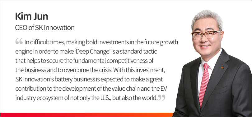 This is SK Innovation’s Deep Change strategy to overcome the crisis with a bold investment amid the global economic downturn and the crisis caused by the COVID-19. This decision will lead to an expansion in the production base of electric vehicle batteries in the U.S., which is a major battleground for global automakers.