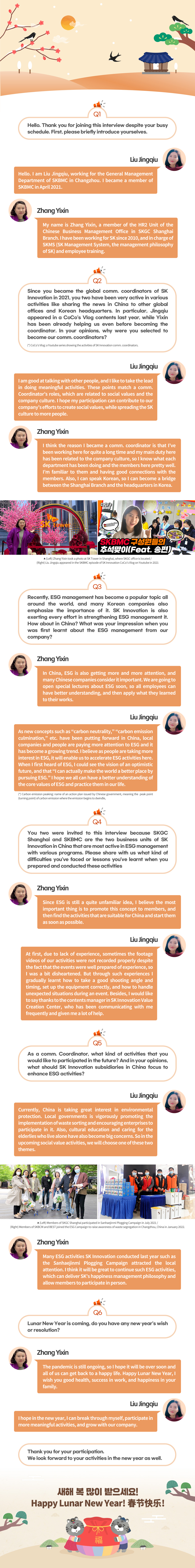 Through this special interview of SKinno News to celebrate the 2022 Lunar New Year, let’s hear Yixin and Jingqiu’s stories to learn more about SK innovation’s ESG activities in China, and check their goals and wishes for the New Year as a global comm. coordinator.