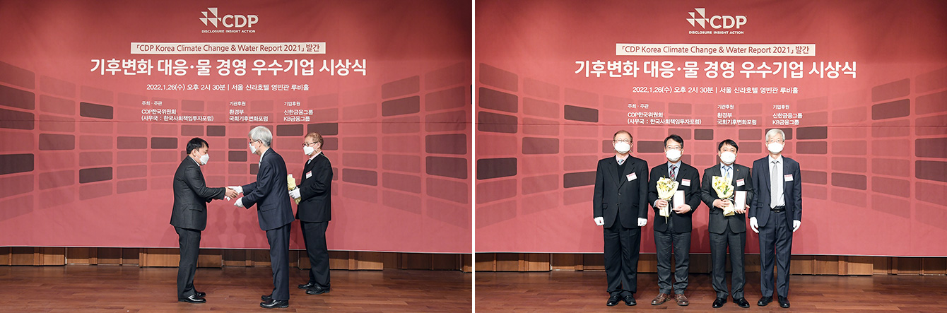 ▲ SK Innovation receives the award as one of Carbon Management Sector Honors of Climate Change category in the CDP Korea Climate Change & Water Report 2021. First from left in left photo, third from left in the right photo: Kim Jong-hwa, Head of SHE Division, SK Innovation. Second from left in the left photo, first from right in the right photo: CDP Korean Committee Chairman Jang Ji-in