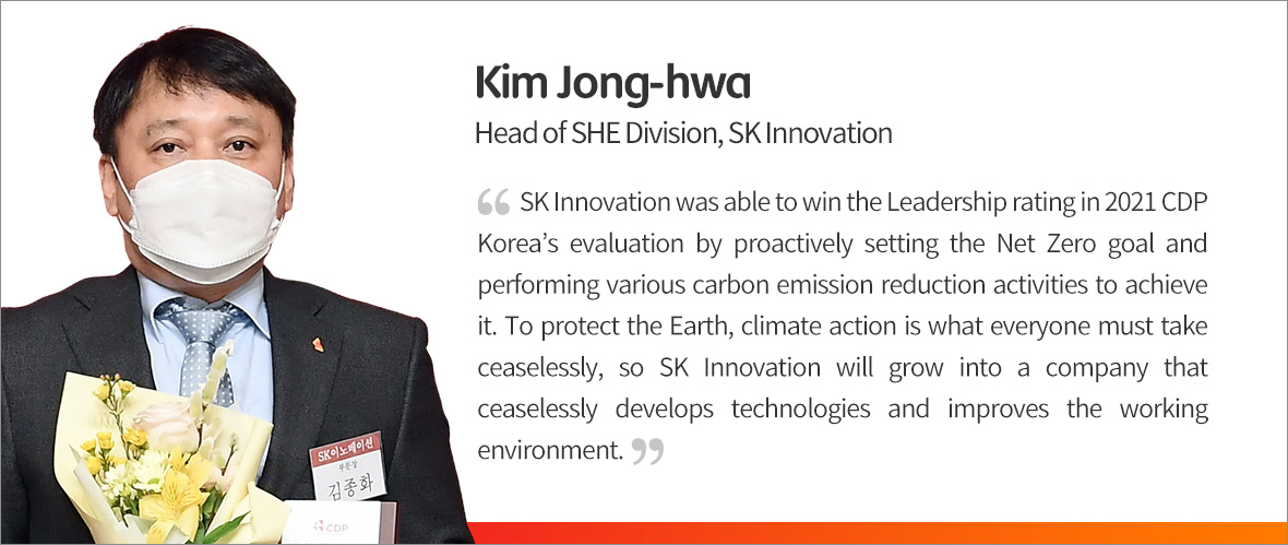 In recent years, with strong commitment, SK Innovation has been steadily carrying out activities to reach Net Zero target. It was well recognized for its field application activities of various carbon reduction technologies such as recycling waste plastic, lubricants, batteries (so called “BMR” – Battery Metal Recycle business), and conversion into eco-friendly fuel oil. Such effort has brought SK Innovation rating A minus (A-) in 2021. This is the highest among oil companies in the sector last year.