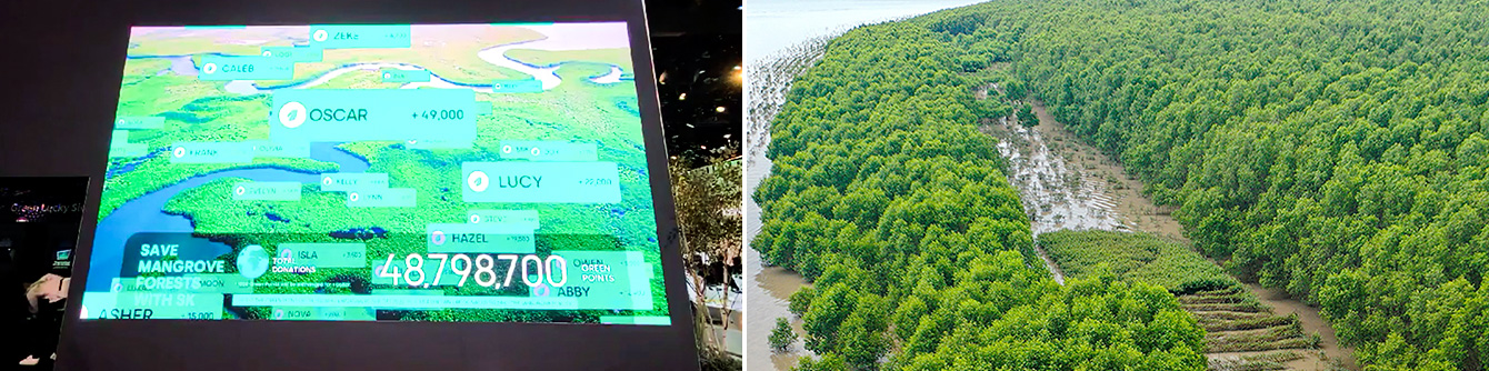 ▲ (Left) Green Points donated for the Mangrove Reforestation Project by visitors are shown on the large screen inside SK exhibition hall at CES 2022 / (Right) SK Innovation has been operating the Mangrove Reforestation Project in Vietnam since 2018