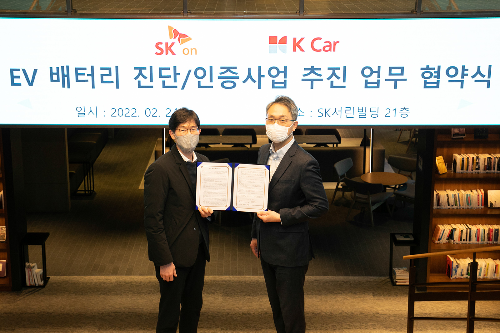 (Photos) Jeong Woo-seong, Head of e-Mobility Business Office of SK On (left) and Jeon Ho-il, Head of Marketing Division of K Car (right) take commemorative photos at the agreement ceremony held in SK Seorin Building, Seoul, Korea, on February 24, 2022.
