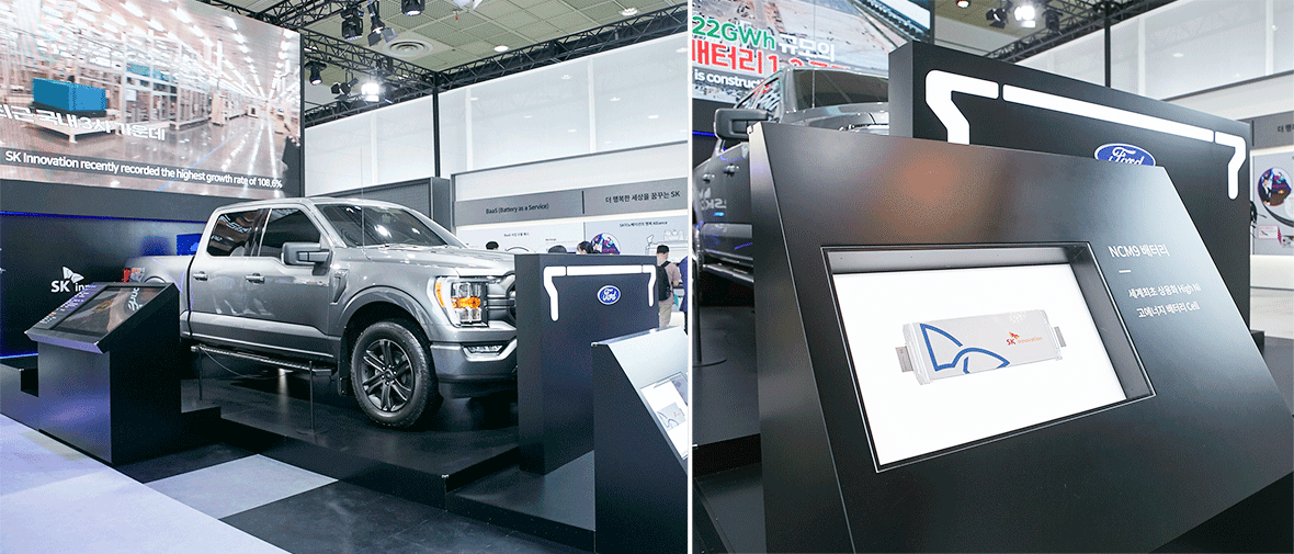 (Photo 3,4) (Left) Ford’s F-150 equipped with SK battery NCM9 / (Right) NCM9 battery displayed inside SK Innovation’s booth at Interbattery 2021