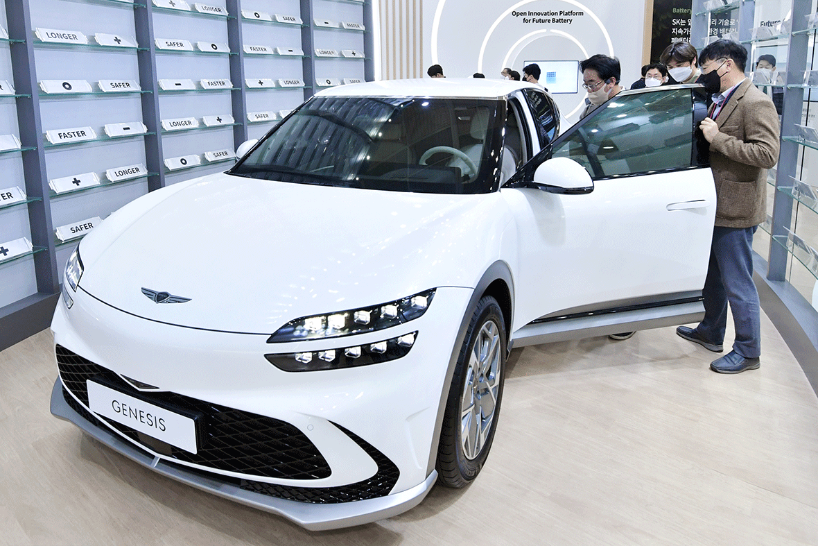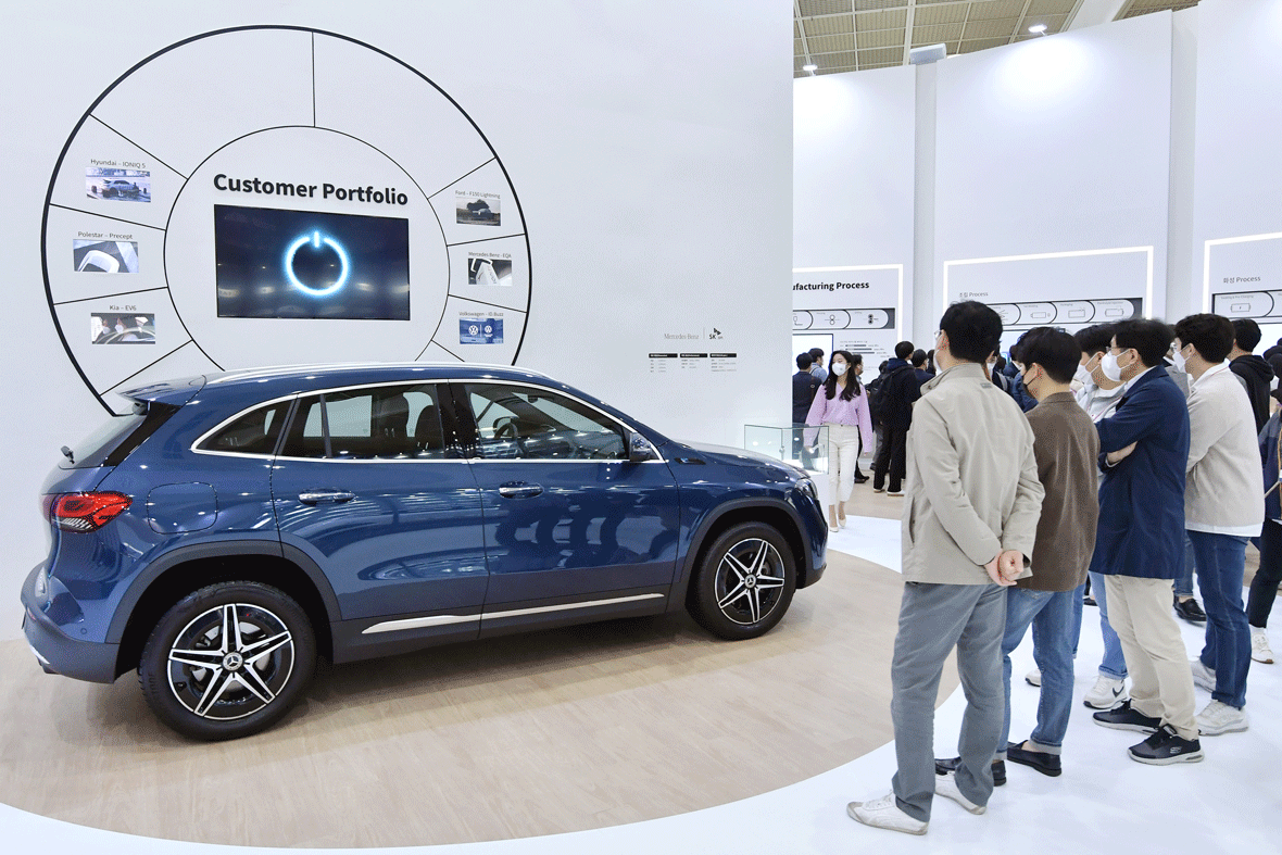 (Photo 1, 2, 3) At InterBattery 2022, SK On displays multiple electric vehicles including Hyundai Genesis GV60, Mercedes-Benz EQA, and Ferrari SF90 Spider to highlight the partnership with global automakers.