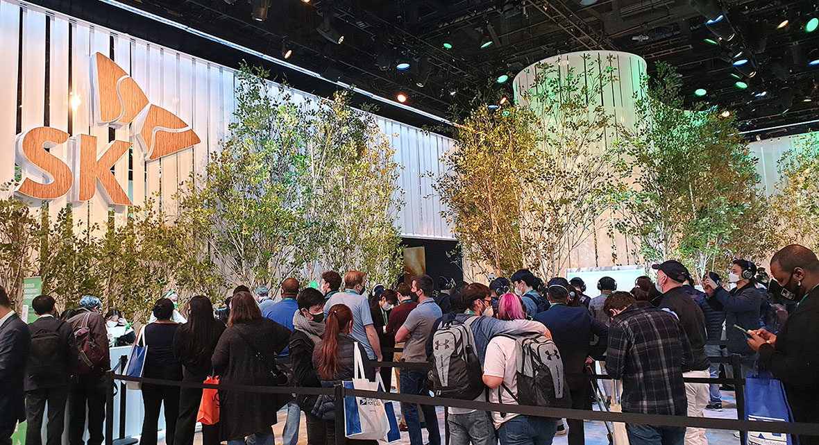 ▲ Visitors wait in line to enter SK’s Green Forest Pavilion at CES 2022