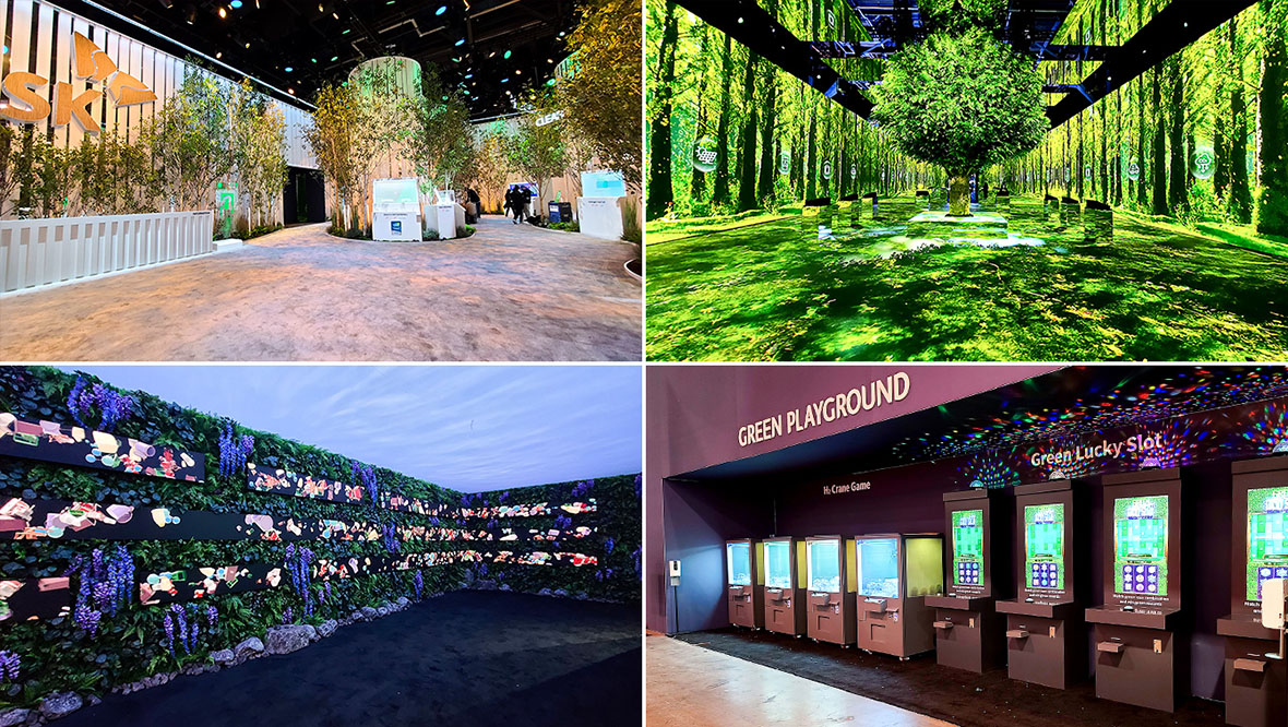 ▲ (Clockwise from top left) Green Avenue, Tree of Life, Green Playground, Walk to Tomorrow – the four main zones inside SK’s Green Forest Pavilion at CES 2022
