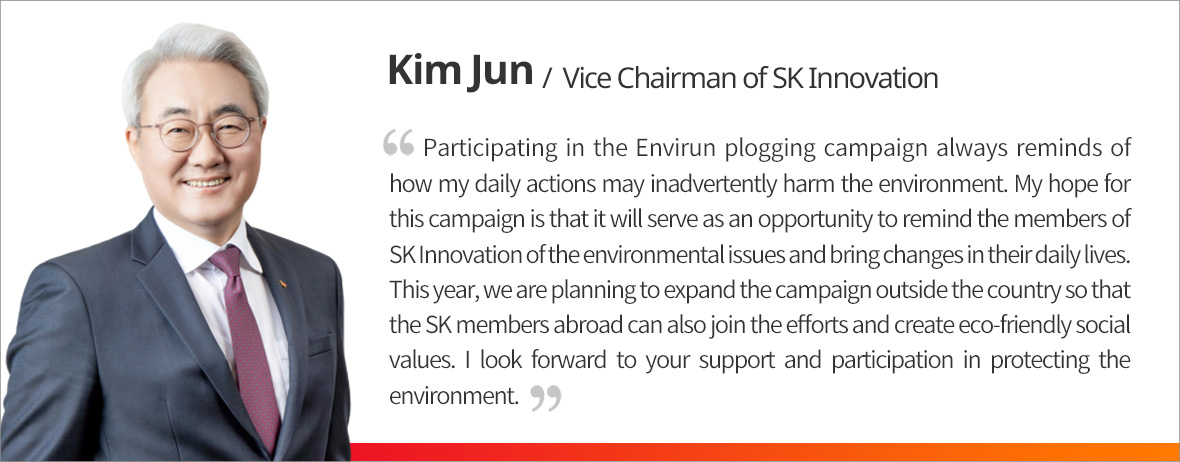 On April 11, Kim Jun, Vice Chairman & CEO of SK Innovation, participated in plogging acitivty in the areas around Jongno-gu, Seoul, where SK Innovation Headquaters is located. This plogging campaign was initiated by SK Innovation in 2021, and it was called Sanhaejinmi in Korea. The English name of the campaign is EnviRun for the Earth, or EnviRun in short.