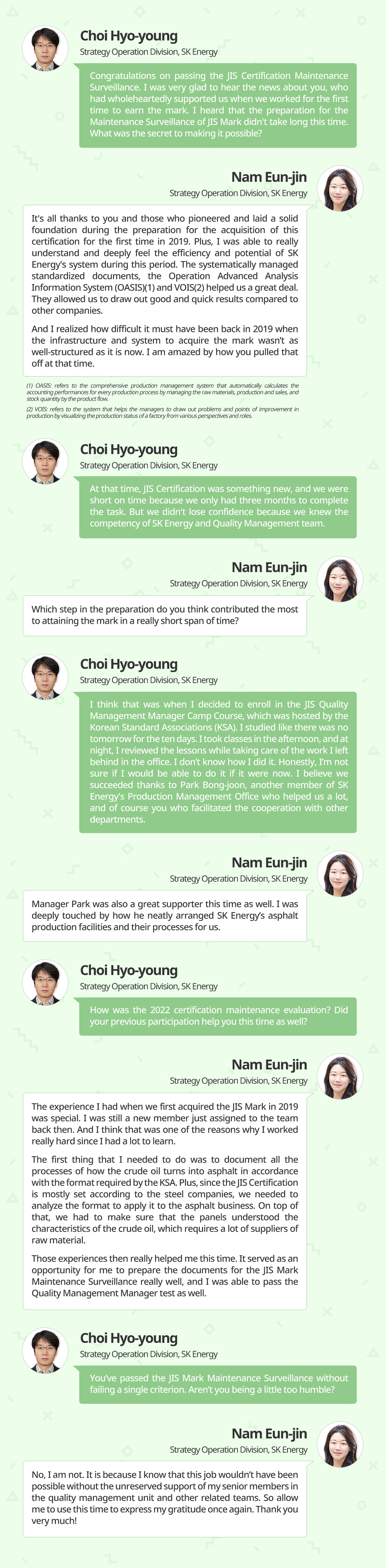 Three years after being qualified for JIS the first time, this year SK Energy passed the certification maintenance evaluation, proving its unrivaled quality. What is more significant about this achievement is that it passed all criteria without falling short of any of them despite having only three months of preparation.